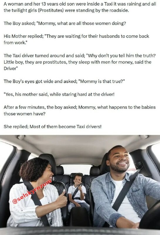 Žena s malým synem jeli taxíkem. Venku pršelo. Na okrajích silnic se tísnily prostitutky. „Mami, co tam ty dámy dělají?“ zeptal se chlapec. „Čekají na manžely, až se vrátí z práce,“ odpověděla žena. Taxikář se k nim otočil: „Proč mu neřeknete prav