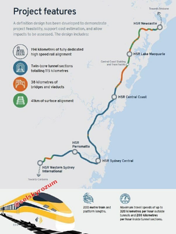 Austrálie začala podrobně projektovat první vysokorychlostní železnici v zemi mezi Newcastle a Sydney. Bude se jednat o novou samostatnou trať pro rychlé vlaky. Stavba bude probíhat po etapách: nejprve k centrálnímu pobřeží, poté k hlavnímu nádraž