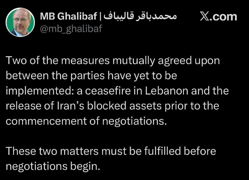 Neuvottelujen lähtöehdot: Yhdysvallat on velvollinen helpottamaan tulitaukoa Libanonissa ja vapauttamaan Iranin omaisuuden jäädyttämisen — Iranin parlamentin puhemies Ghalibaf *Tähän mennessä