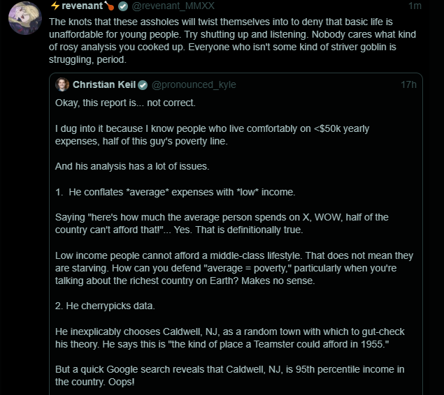 @sickburnbro I can already tell, without needing to read Michael Green's report or Kiel's full rant, that the first point, thus the whole rant, is an outright lie. What does Keil mean that Michael Green is purely "conflating" the $110k figure with the lower percentiles on the current class bell curve (if it's still a bell curve)? Is it simply Green pointing out that the $32k line that demarcated between poor and middle class ten years ago no longer applies because of inflation? How is that pure conflation? That sounds like Green is demanding economists, intellectuals, and influencers respect basic economic realities in their many models and formulae, beyond the other problems. Why is conflation wrong anyways, if the reality is that the number is not representing upper middle class anymore? If the numbers show that average person in America is starting to live like the average of average poorer countries, how is "well the average American is rich ackshully compared to world" proving Green illogically conflates his figure range and the American poor?