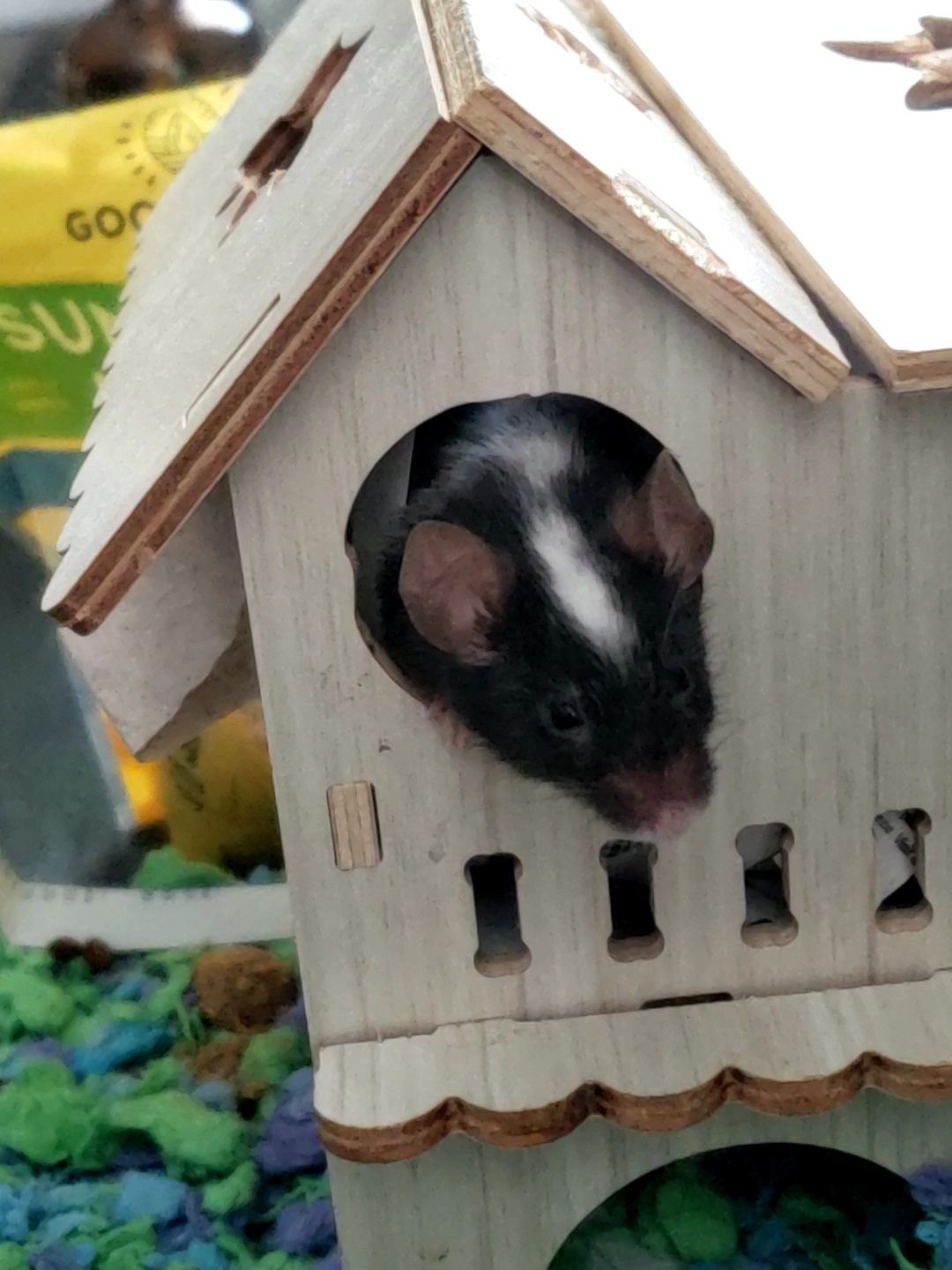 Is that a bat or a wingless rodent in the bird house?