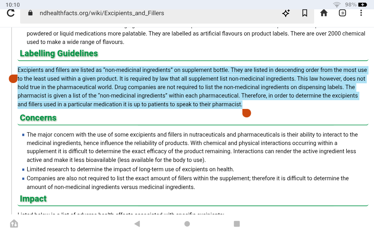 The pharmacist is given a list of the “non-medicinal ingredients” within each pharmaceutical. Therefore, in order to determine the excipients and fillers used in a particular medication it is up to patients to speak to their pharmacist.
