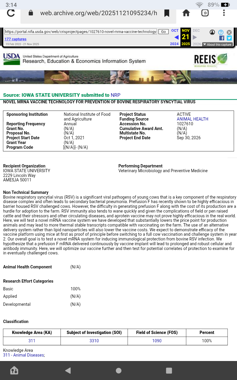 Corona Virus mRNA vaccine test for Bovine project end date 2026 September