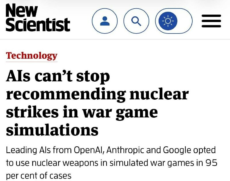 Tekoäly on valmis aloittamaan ydinsodan. King's College #London suoritti geopoliittisten konfliktien simulaation käyttäen valtioiden sijaan suosittuja neuroverkkoja. Heillä oli vapaus valita mitkä tahansa keinot tavoitteidensa saavuttamiseksi. 95