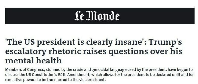 . Francouzský deník Le Monde uvedl, že Donald #Trump je zjevně blázen. Píší, že provokativní rétorika Donalda Trumpa vyvolala otázky ohledně jeho duševního zdraví. Psychiatři už dříve diagnostikovali Donalda Trumpa s narcistickou poruchou osobnosti