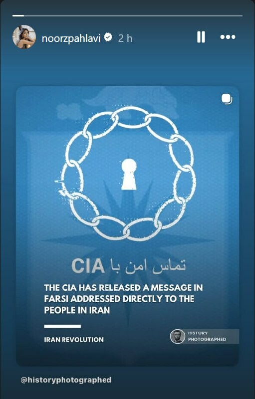 — Hänen keisarillinen korkeutensa Iranissa, prinsessa Noor Pahlavi, jakaa CIA:n mainoksen, jossa kehotetaan Iranin väestöä yhteistyöhön Yhdysvaltain tiedustelupalvelun kanssa Iranin islamilaista tasavaltaa vastaan