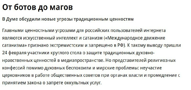 Tekoäly ja satanismi* nimettiin venäläisten suurimmiksi uhkiksi verkossa. Tähän johtopäätökseen tulivat osallistujat pyöreän pöydän keskustelussa perinteisten hengellisten ja moraalisten arvojen suojelemisesta mediamaailmassa. *nimetty äärimmäisek