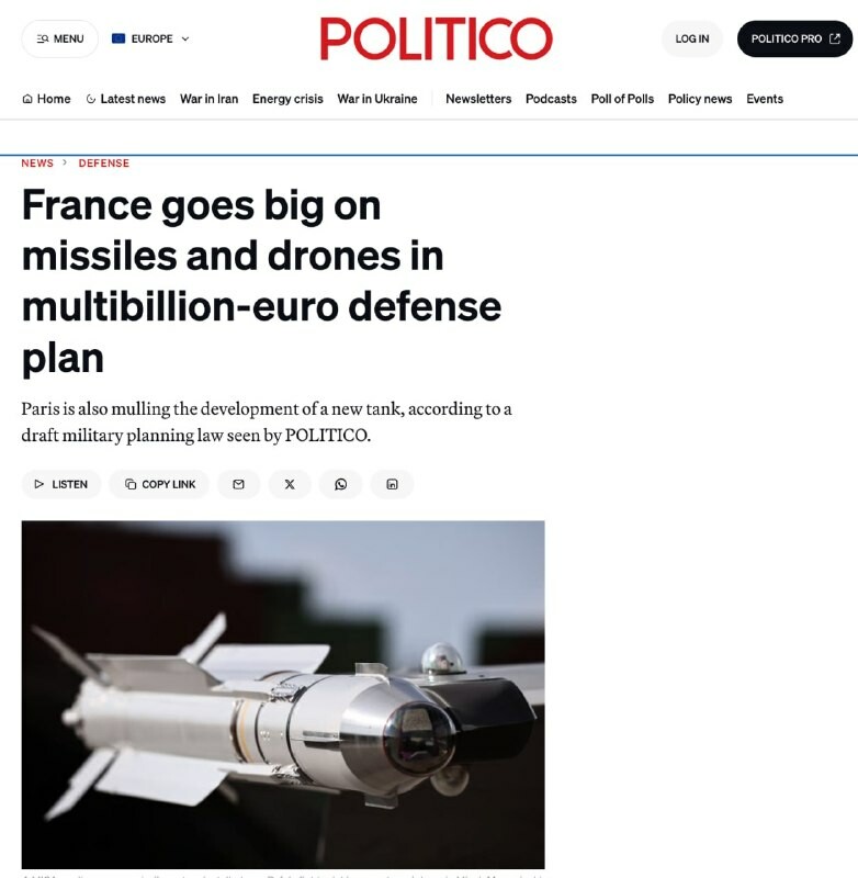 Francúzsko sa pripravuje na vojnu: Paríž plánuje do roku 2030 strojnásobiť zásoby rakiet a dronov, — Politico Budúci francúzska vláda predstaví aktualizovaný zákon o vojenskom plánovaní, ktorý počíta s vyčlenením 8