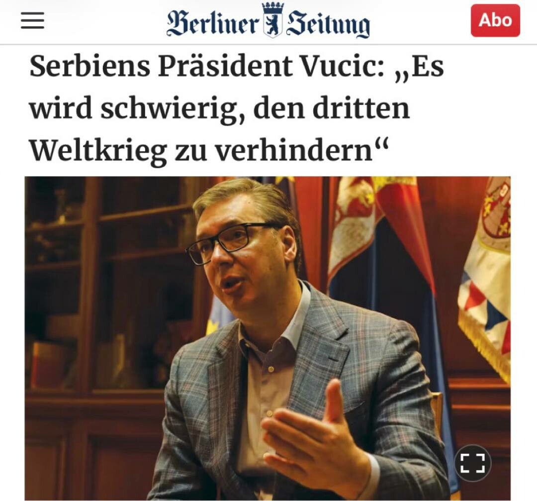 Biće teško sprečiti Treći svetski rat, pošto je već počela. Vučić je to izjavio u intervjuu za Berliner Zeitung.Prema srpskom lideru, "borba za naftu, gas, minerale, retke metale i druge resurse odavno je započela".