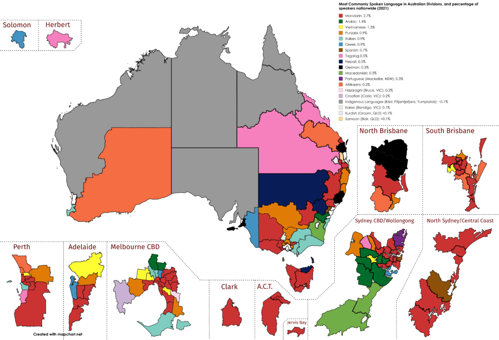 Most Commonly Spoke Language at Home in Australian Divisions, and percentage of nationwide speakers, (ABS Census, 2021) https://www.byteseu.com/1963213/ #Map #MapPorn #MapPorn #Maps