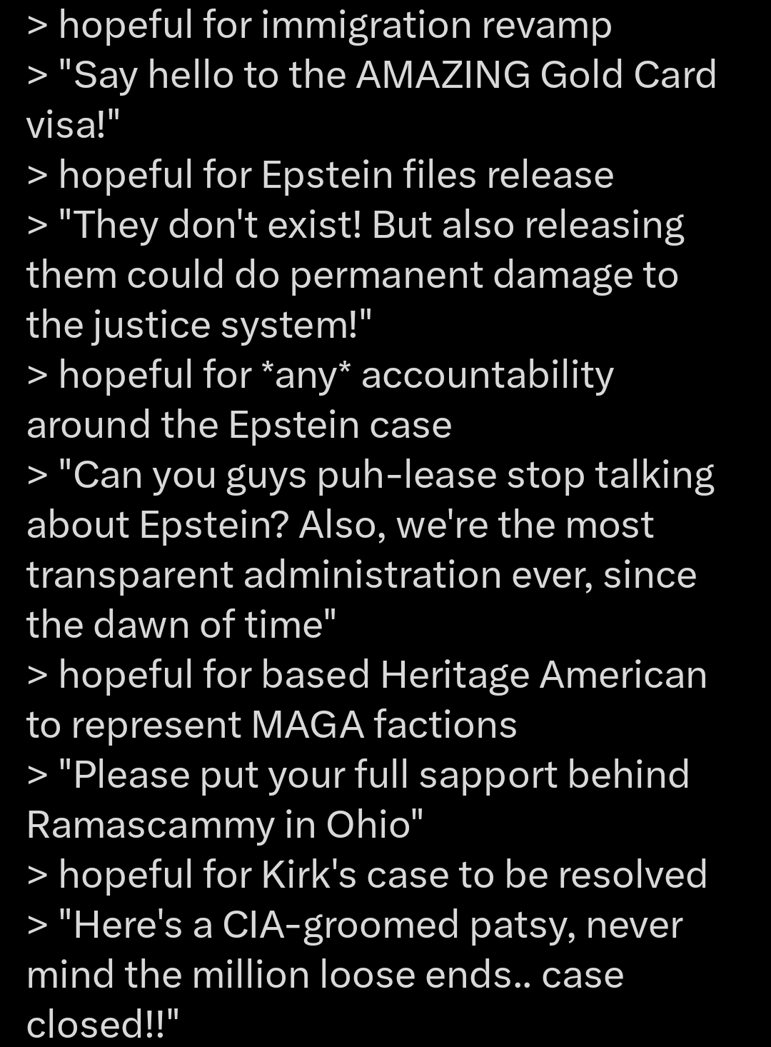 * 100% transparent government: no more secrets, no more backroom deals, no more treacherous treaties, and the personal financies of every elected official should be available for review by everyone effected by their position.